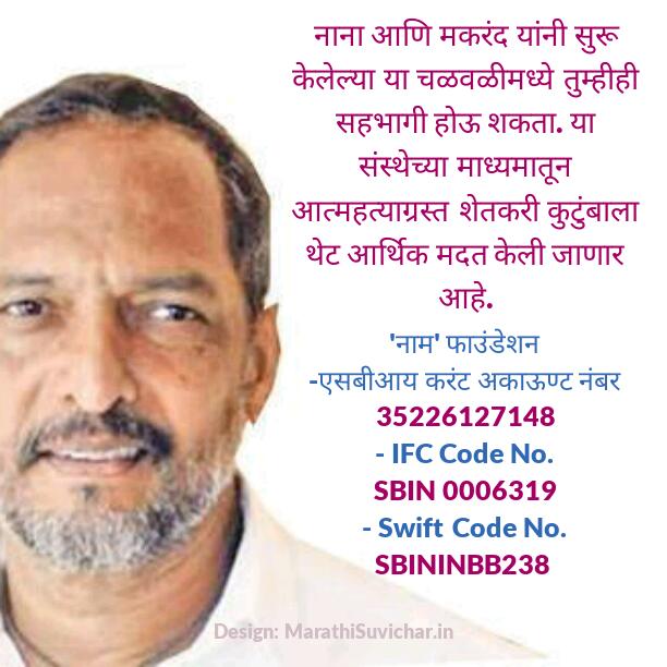 ऑगस्ट - सप्टेंबर २०१५ च्या दर्म्यान महाराष्ट्रातील विदर्भ आणि मराठवाडा या दुष्काळी भागांमध्ये आत्महत्याग्रस्त शेतकऱ्यांच्या कुटुंबीयांना अभिनेते नाना पाटेकर आणि मकरंद अनासपुरे यांनी वैयक्तिक पातळीवर आर्थिक मदत केली. सुरुवातीला नांदेड, परभणी, हिंगोली जिल्ह्यांतील २०१५ या वर्षी आत्महत्या केलेल्या २३० शेतकऱ्यांच्या कुटुंबीयांना प्रत्येकी १५ हजारांचा धनादेश, ब्लँकेट, साडी-चोळी, वर्षभराचे मेडिकल किट असे मदतीचे स्वरूप होते.परंतु, फक्त काही निवडक कुटुंबीयांना मदत करण्यापेक्षा या मदतीची व्याप्ती वाढवण्यासाठी नाना पाटेकर आणि मकरंद अनासपुरे यांनी एका सामाजिक संस्थेची स्थापना करण्याचे ठरवले. मदतीचे स्वरूप फक्त आर्थिक मदत न रहाता, शेतकऱ्यांना व त्यांच्या कुटुंबियांना काही पर्यायी उत्पन्नाचे साधन उपलब्ध करून देणे याकडे पण लक्ष देता यावे यासाठीसुद्धा या संस्थेची कल्पना पुढे आली.[३] या कल्पनेचे रुपांतर नाम फाउंडेशन या संस्थेमध्ये झाले. नाना पाटेकर यांनी सप्टेंबर २०१५ मध्ये पुण्यातील धर्मादाय सहआयुक्त कार्यालयात संस्थेची नोंदणी केली